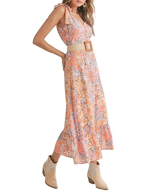 Moonscape Woven V-Neck Tie Strap Button Front A-Line Tiered Midi Dress