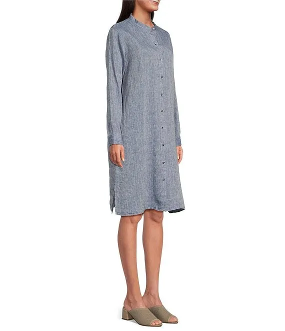 Organic Linen Yarn-Dyed Mandarin Collar Long Sleeve Button-Front Shirt Dress
