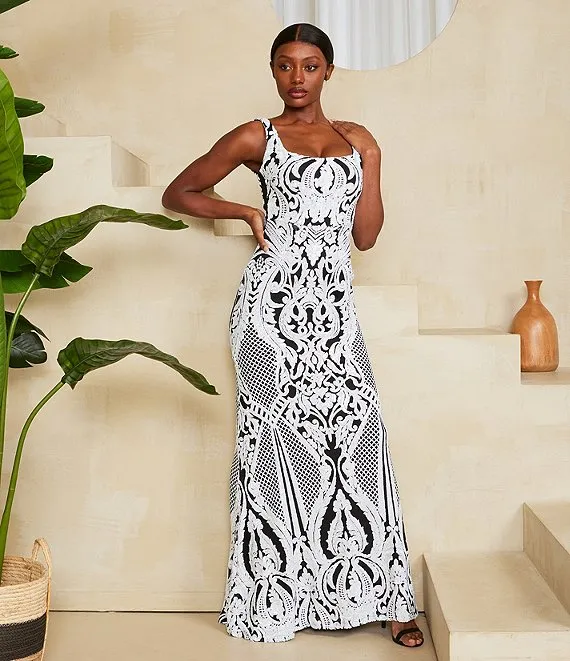 Placement Sequin Sleeveless Square Neck Long Dress