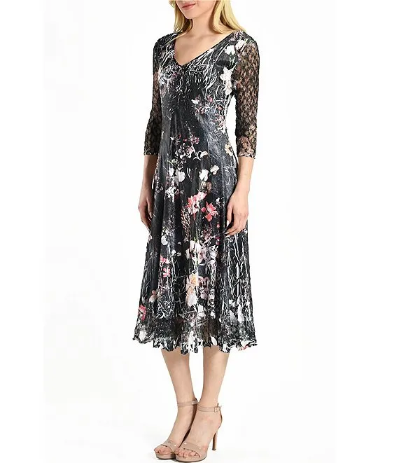 Pleated Charmeuse V Neckline Lace 3/4 Sleeve A Line Midi Dress