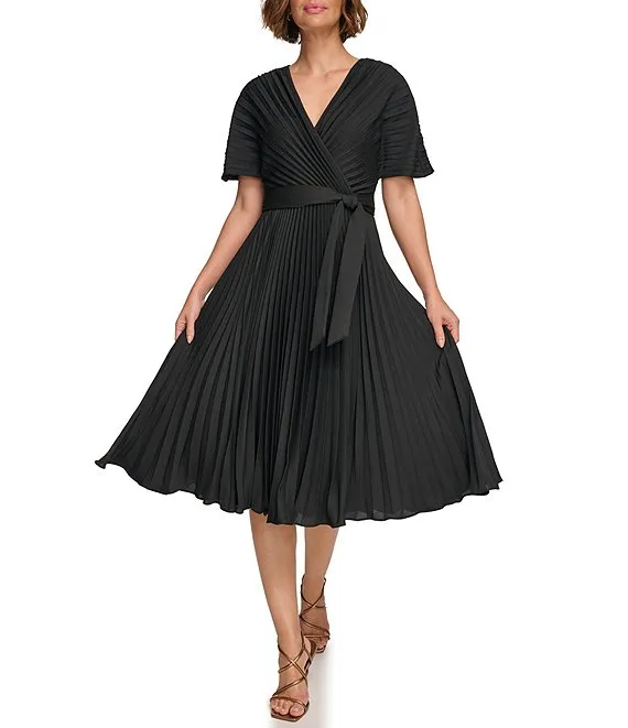 Pleated Surplice V-Neckline Short Sleeve Midi Dress