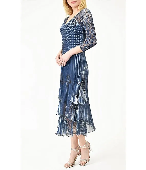 Pleated V-Neckline 3/4 Sleeve Tiered Chiffon With Lace Dress