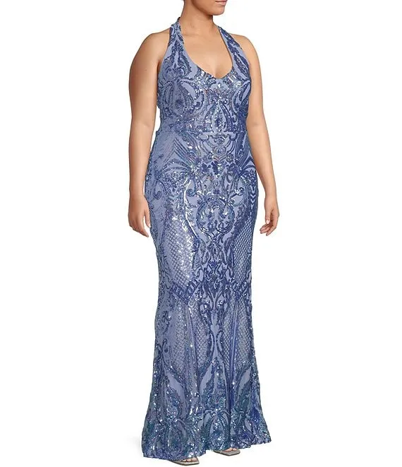 Plus Halter Neck Pattern Sequin Long Dress