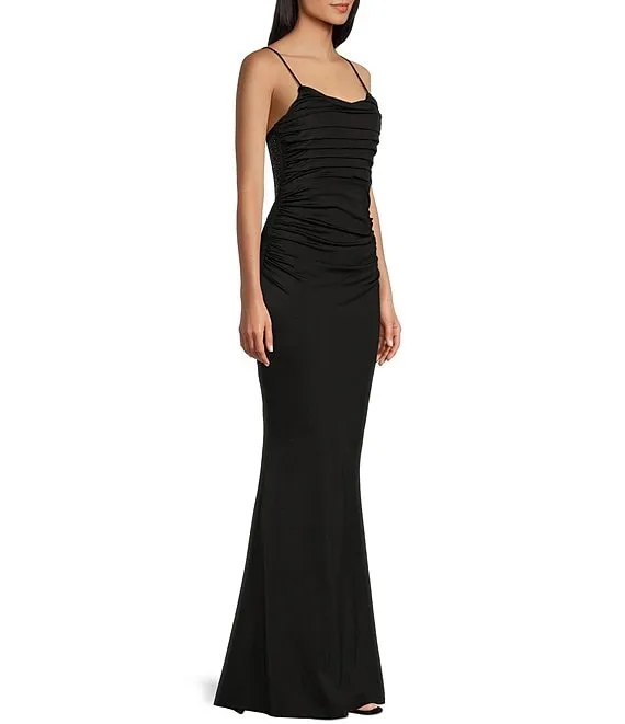 Scoop Neck Shirred Illusion Mesh Rhinestone Back Long Dress