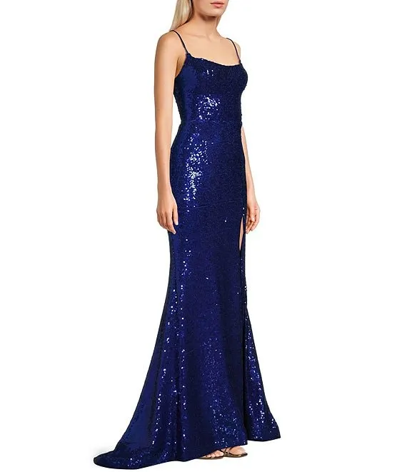 Scoop Neck Spaghetti Strap Lace-up-Back Slit Hem Sequin Gown