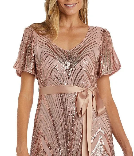 Short Puffed Sleeve Scoop Neck Sequin Long Dress