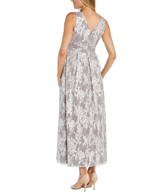 Sleeveless V-Neck Rhinestone Trim Waist Foil Print Mesh Dress