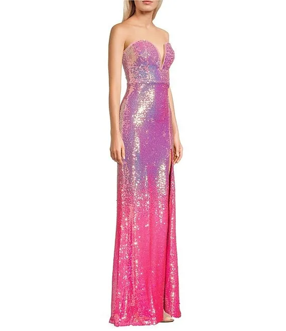 Strapless Ombre Sequin Lace-Up Back Front Slit Long Dress