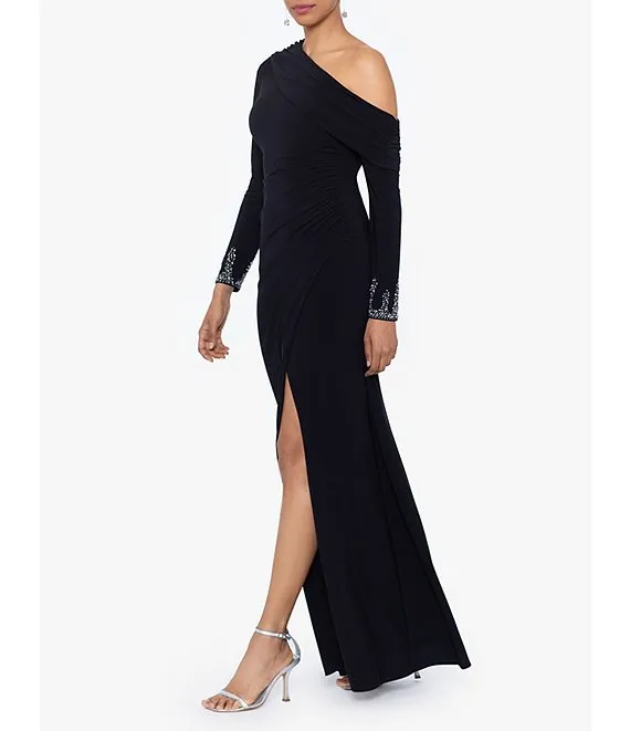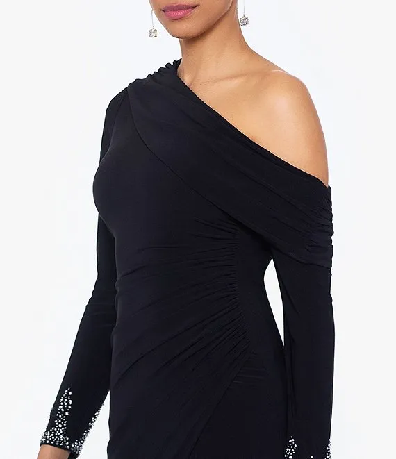 Stretch Off the Shoulder Long Sleeve Beaded Cuff Ruched Waist Gown