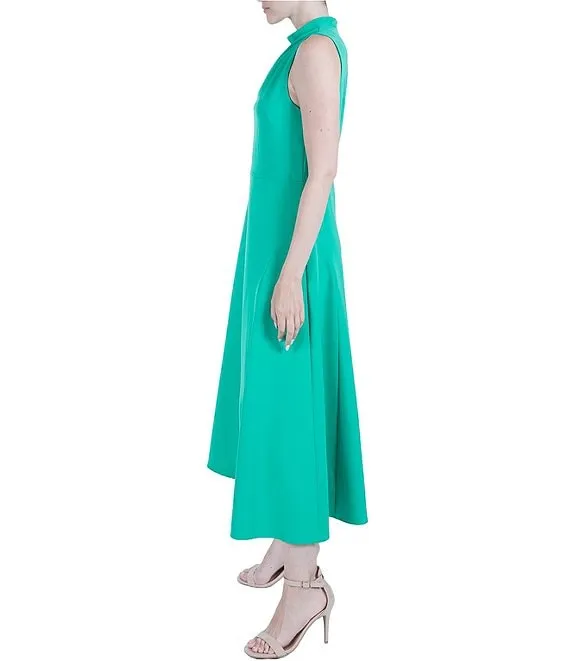 Stretch Scuba Mock Neck Gathered Shoulder Sleeveless Fit and Flare Midi Dress