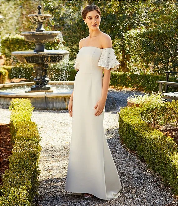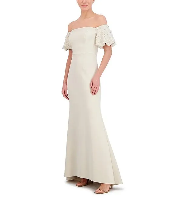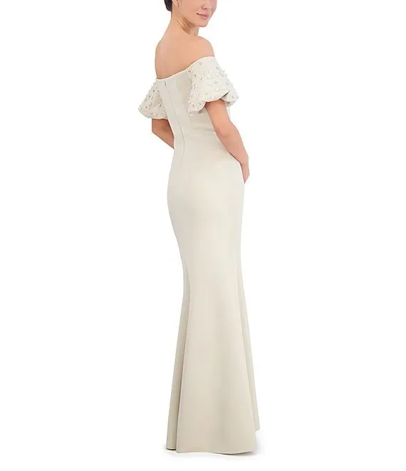 Stretch Scuba Pearl Embellished Short Puff Sleeve Off-The-Shoulder Mermaid Gown