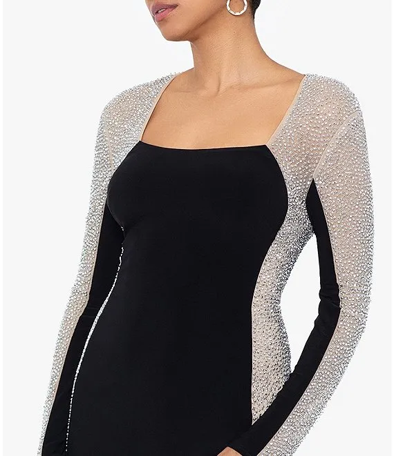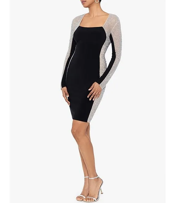 Stretch Square Neckline Beaded Long Sleeve Bodycon Dress