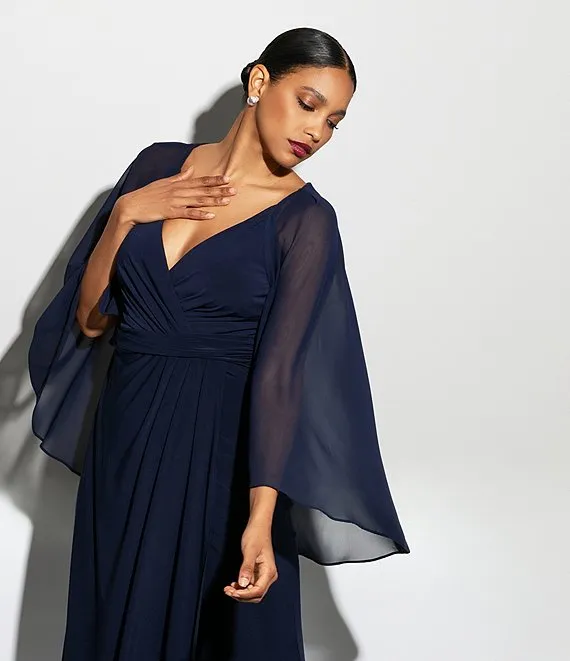 Stretch V-Neck Sleeveless Cape Back Twisted Bodice Gown