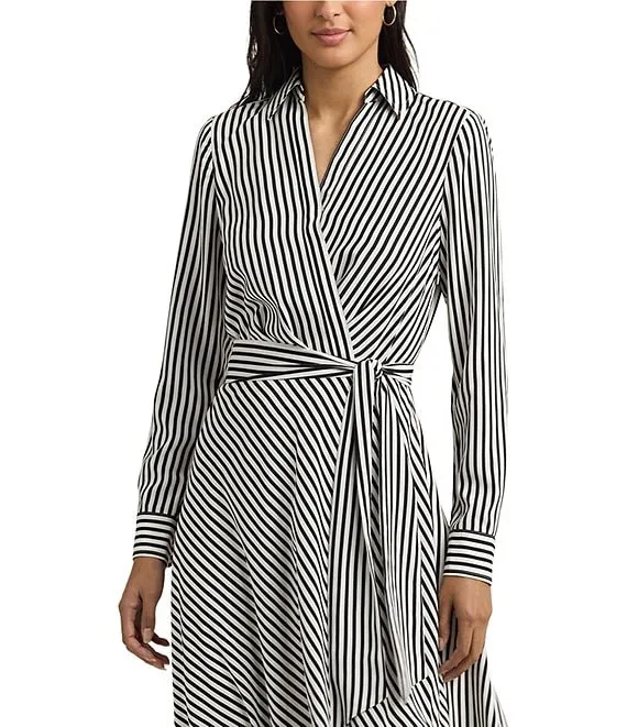 Lauren Ralph Lauren Stripe Print Surplice Collar Neck Long Sleeve Tie Front Dress