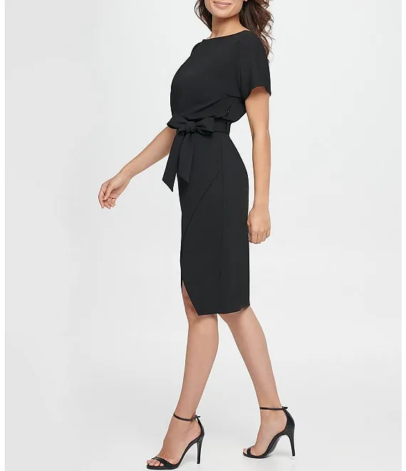 Textured Knit Boat Neck Self-Tie Waist Faux Wrap Blouson Dress