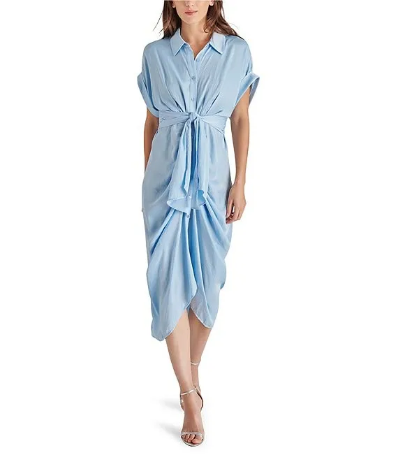Tori Satin Point Collar Short Kimono Cuff Sleeve Belted Ruched Front Asymmetrical Hem Midi Shirt Dress