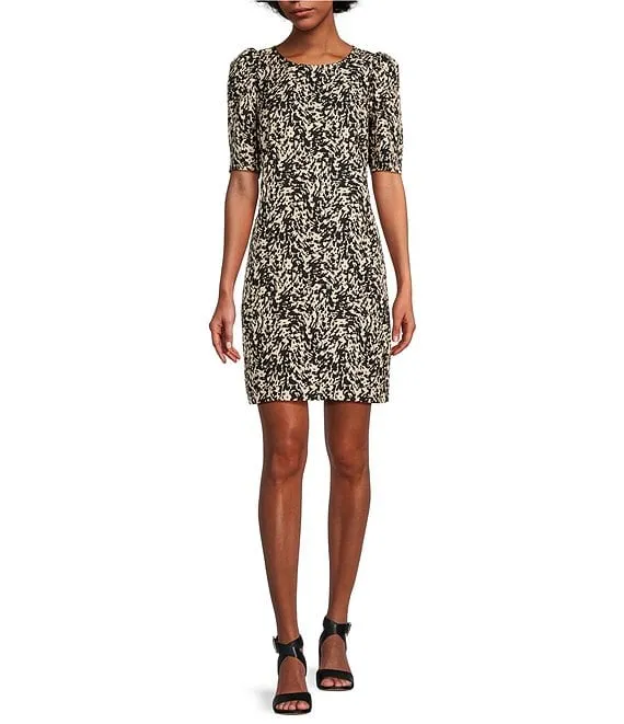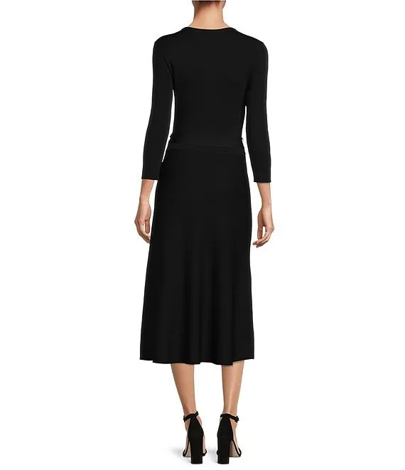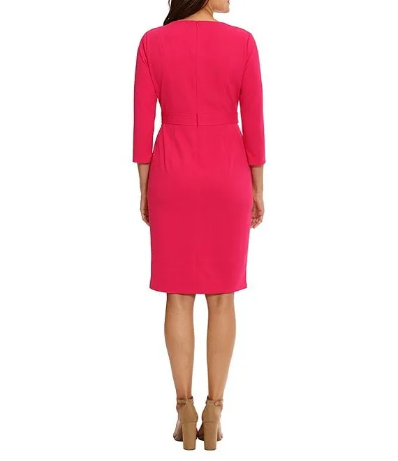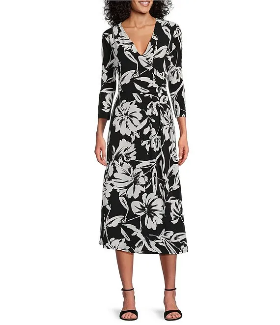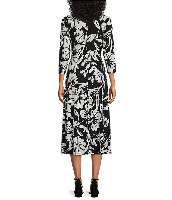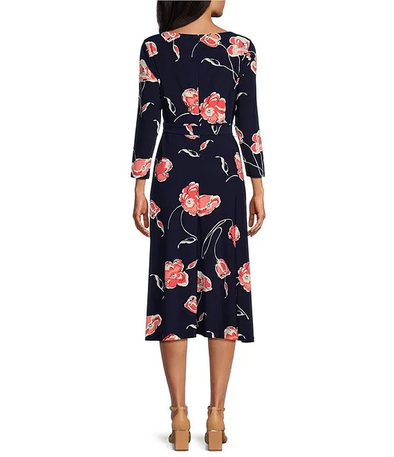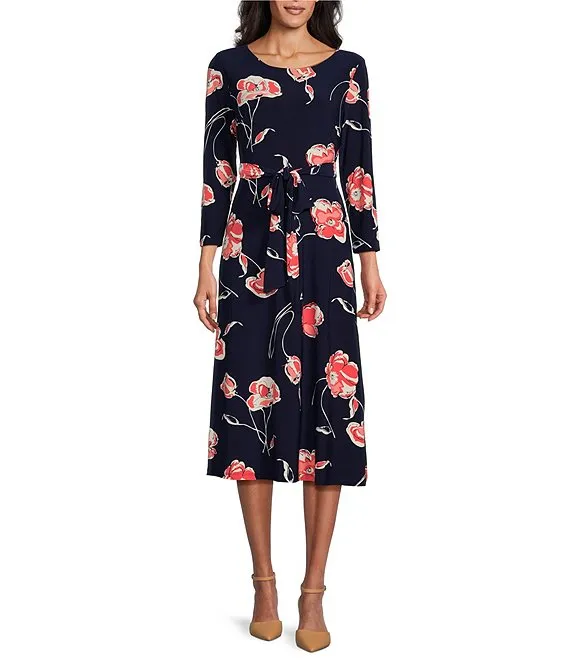 Kasper Stretch Woven Floral Print Scoop Neck 3/4 Sleeve Belted Fit & Flare Midi Dress