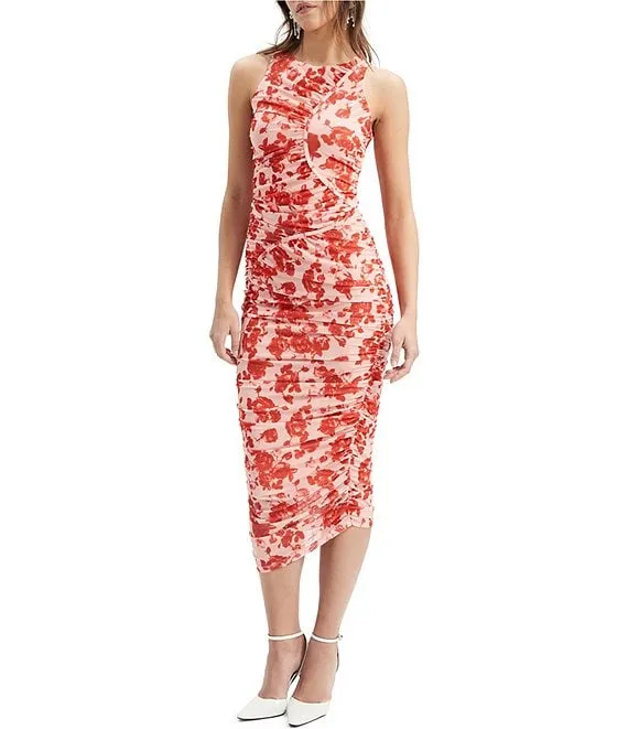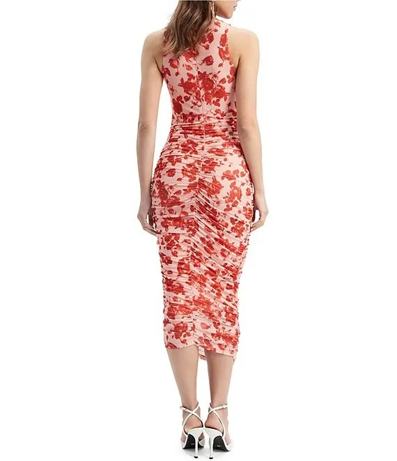 Stretch Floral Mesh Halter Neck Sleeveless Ruched Bodycon Midi Dress