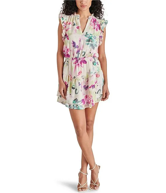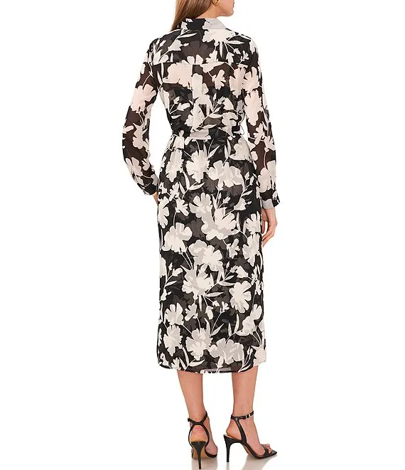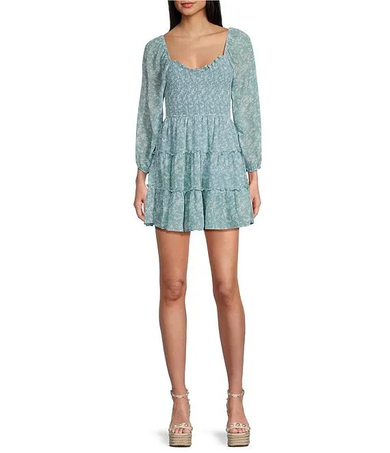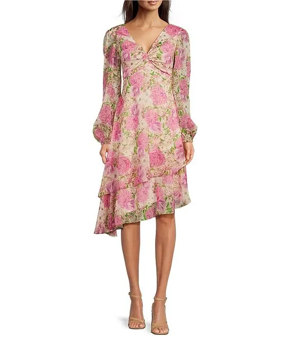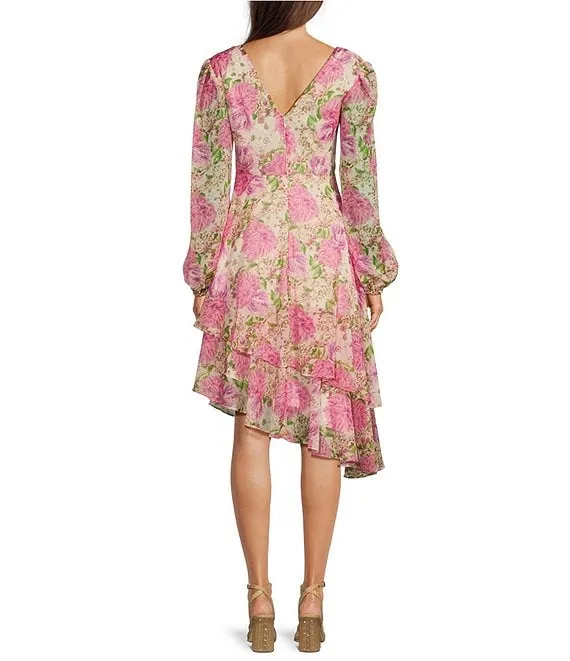 Long Puff Sleeve Fit & Flare Ruffle Trim Smocked Bodice Floral Printed Chiffon Dress