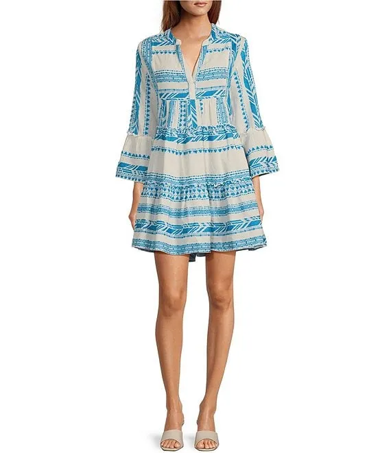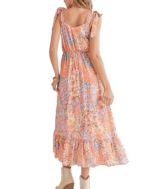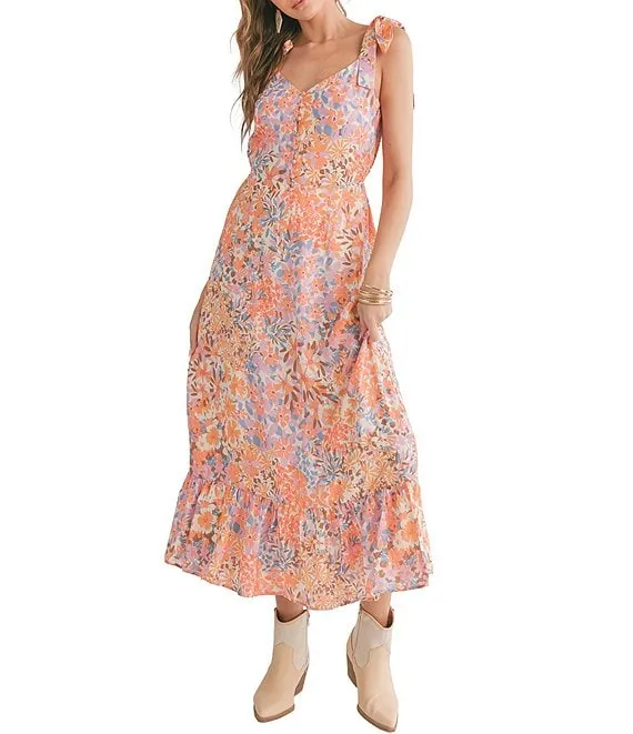Moonscape Woven V-Neck Tie Strap Button Front A-Line Tiered Midi Dress