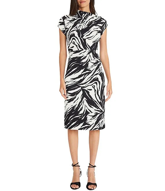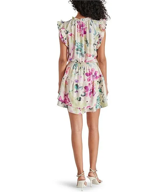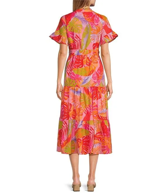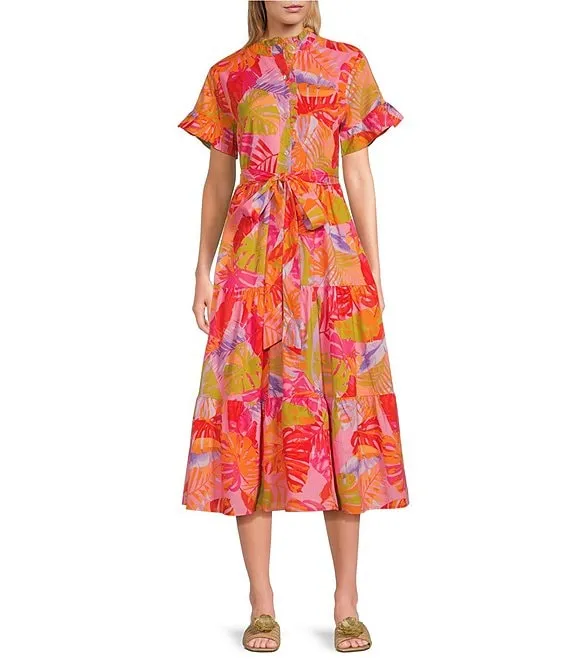 Eden Printed Button Up Ruffle High Neck Short Sleeve Tie Waist Side Pocket A-Line Midi Dress