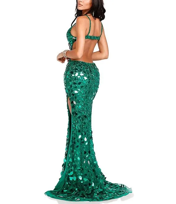 Mirror Beaded Open Back Side Slit Gown