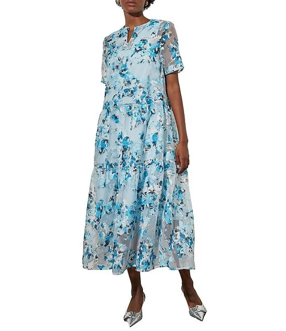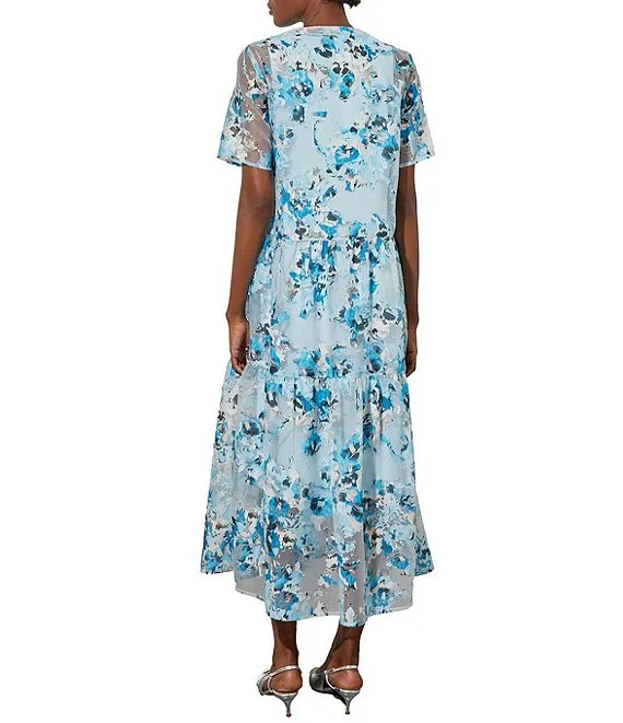 Woven Sheer Floral Print Split Round Neck Short Sleeve A-Line Tiered Maxi Dress