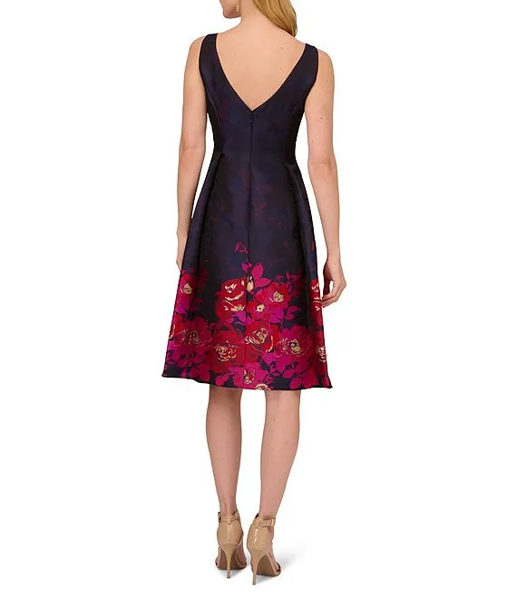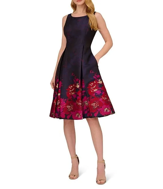 Adrianna Papell Sleeveless Metallic Floral Border Print A-Line Dress