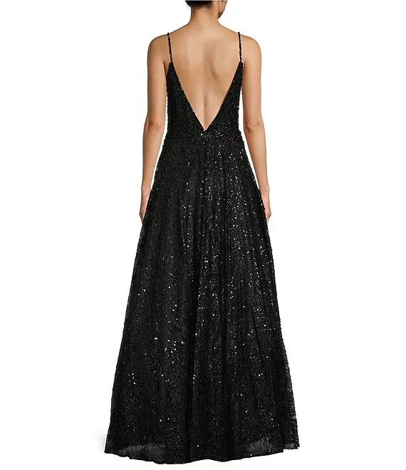 Glitter Mesh Deep V-Neck Low Back Ball Gown
