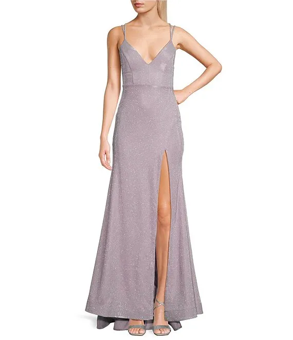 Glitter Double Strap Lace-Up Back Front Slit Long Dress