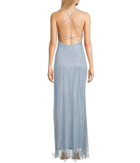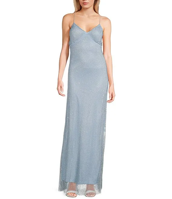 Rhinestone Netting V-Neck Open Back Long Dress