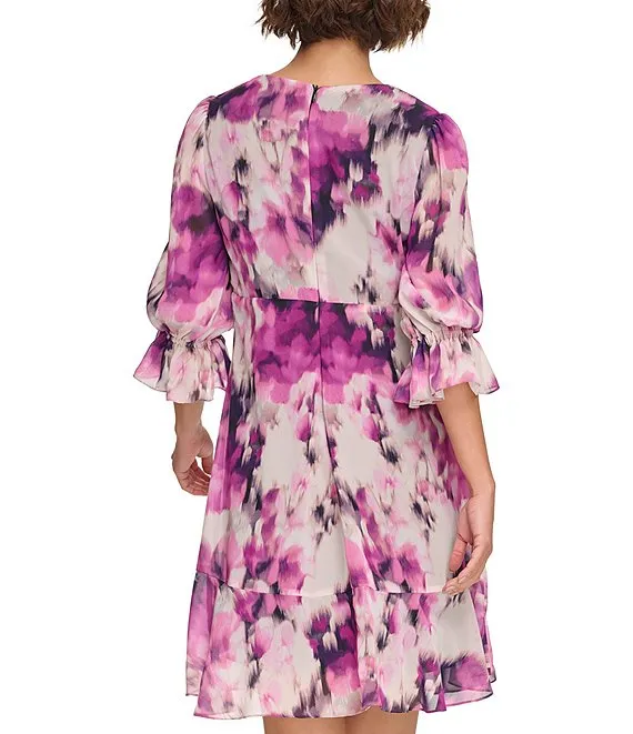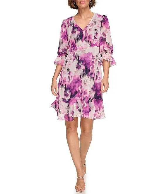 Petite Size 3/4 Sleeve V-Neck Ruffle Hem Printed Chiffon Empire Waist Dress