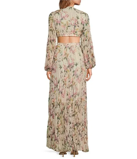 ASTR The Label Revery Floral Print V-Neck Long Sleeve Side Cut-Out Thigh High Slit Pleated Maxi Dress
