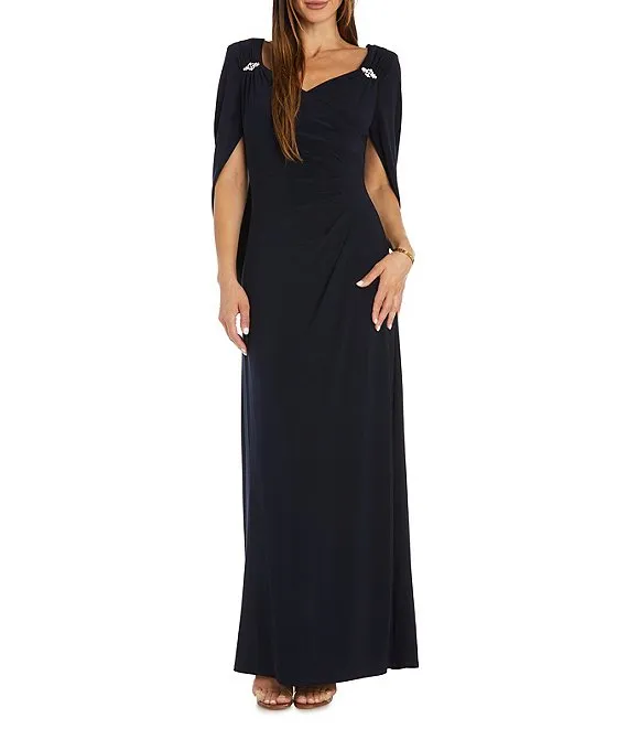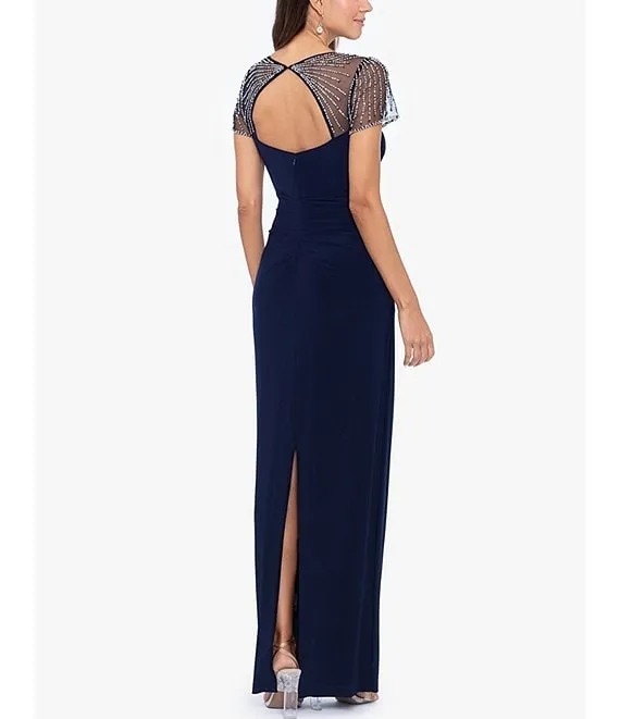 Square Neck Short Beaded Sleeve Open Back Gown