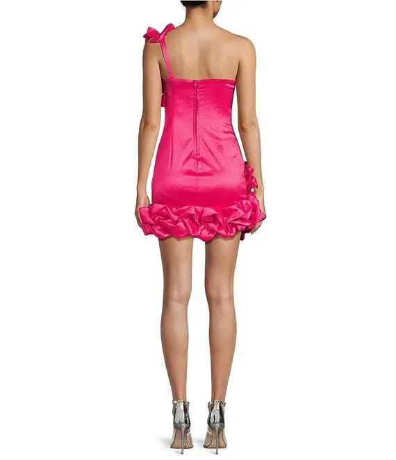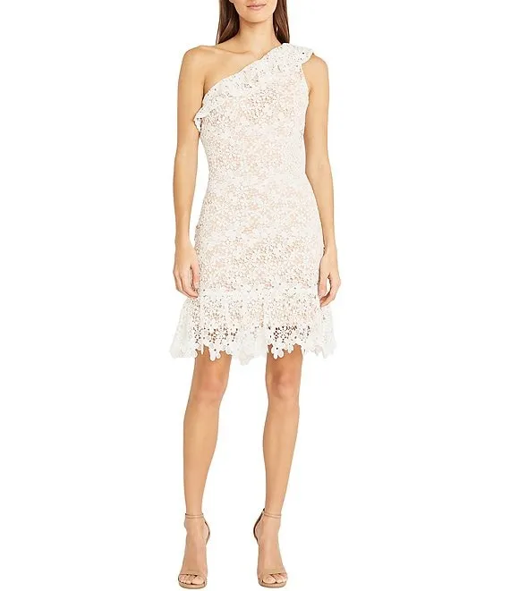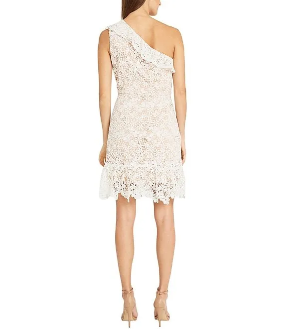 Lace One Shoulder Ruffle Trim Sleeveless Mini Dress