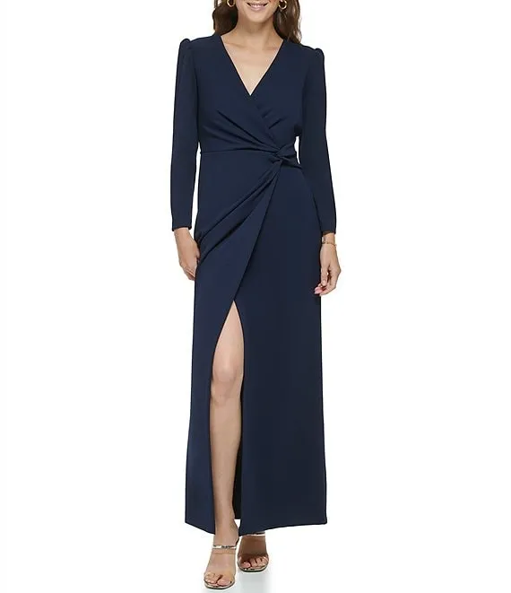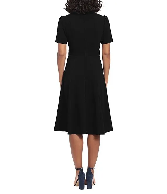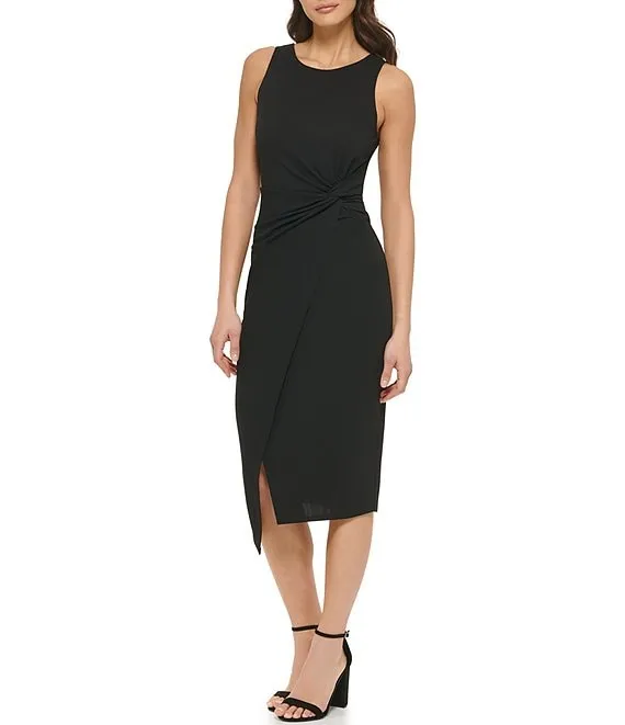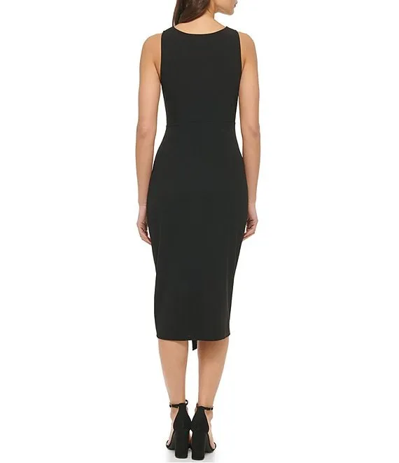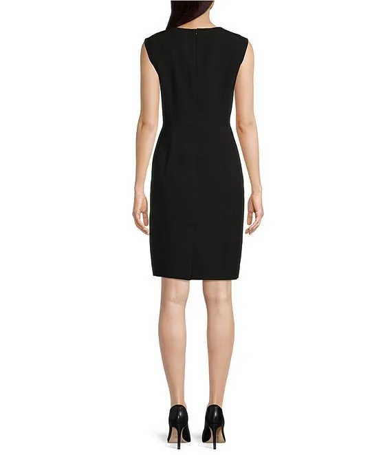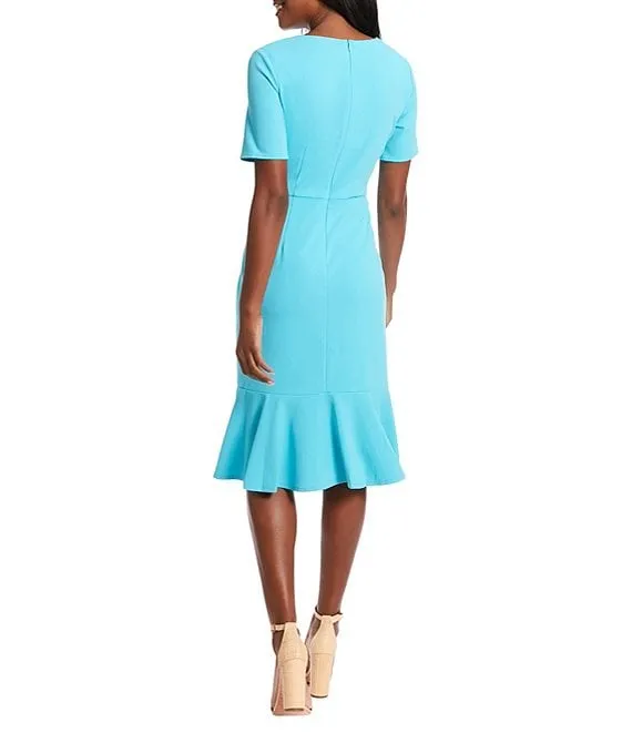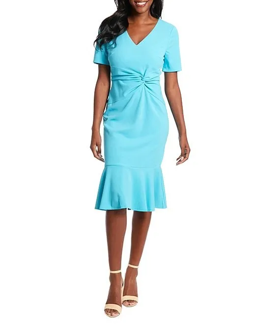 Short Sleeve V-Neck Knot Front Scuba Crepe Sheath Dress