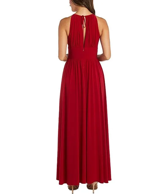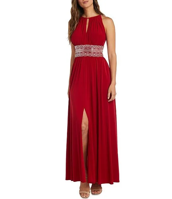 Sleeveless Halter Keyhole Neck Detail Waist Front Slit A-Line Gown