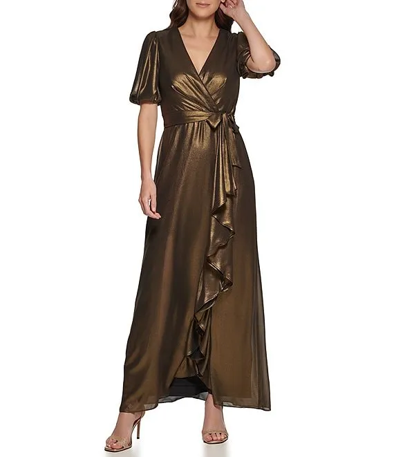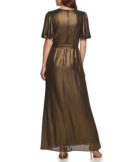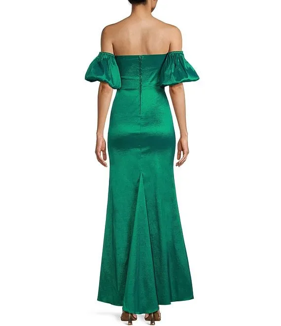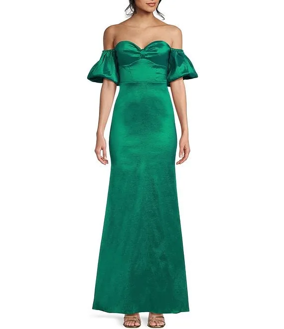 Off-The-Shoulder Puffed Short Sleeve Taffeta Long Dress