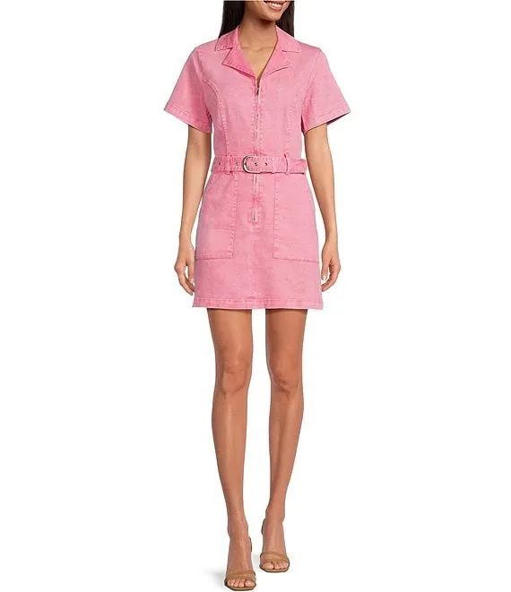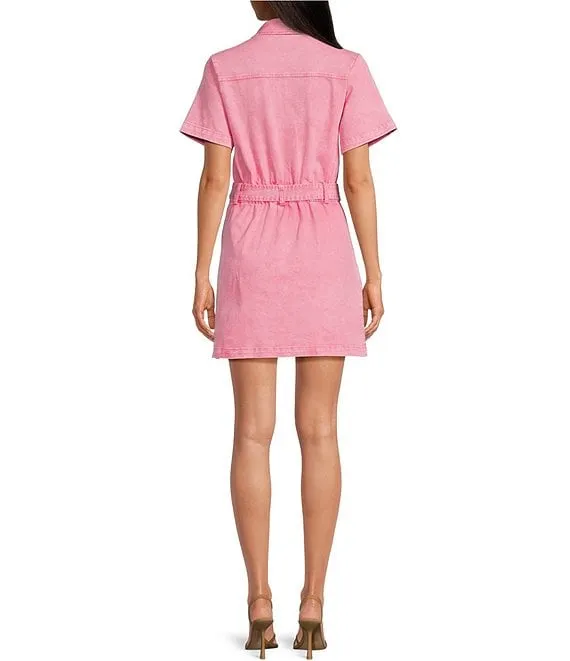 Denim Notch Collar Short Sleeve Belted Mini Dress