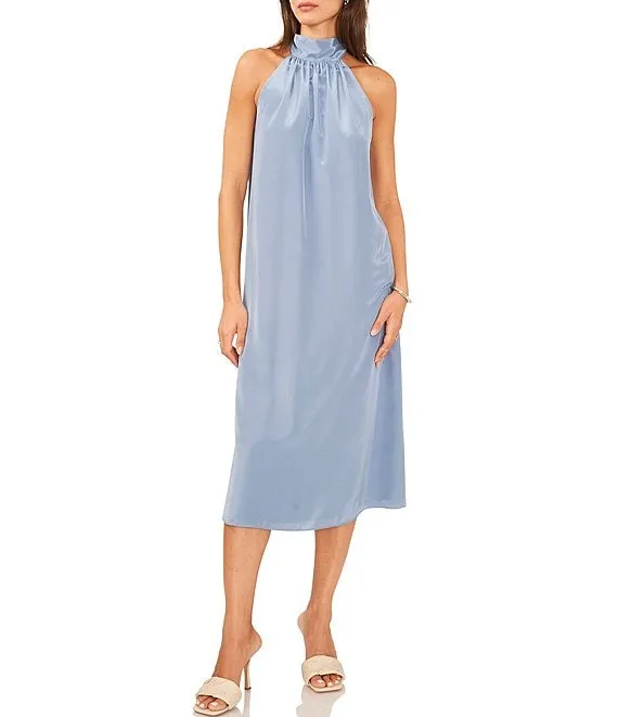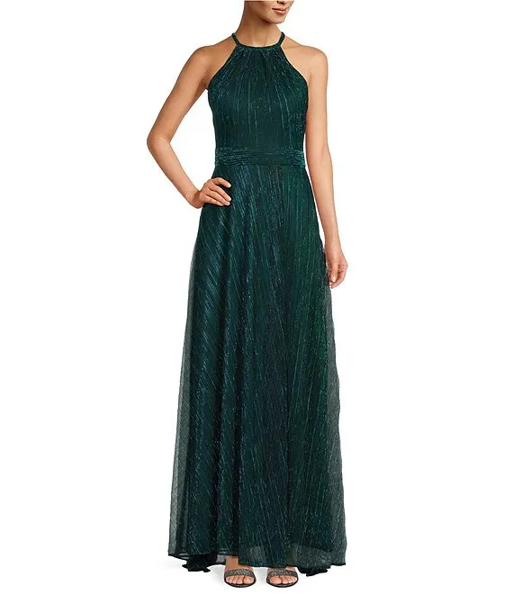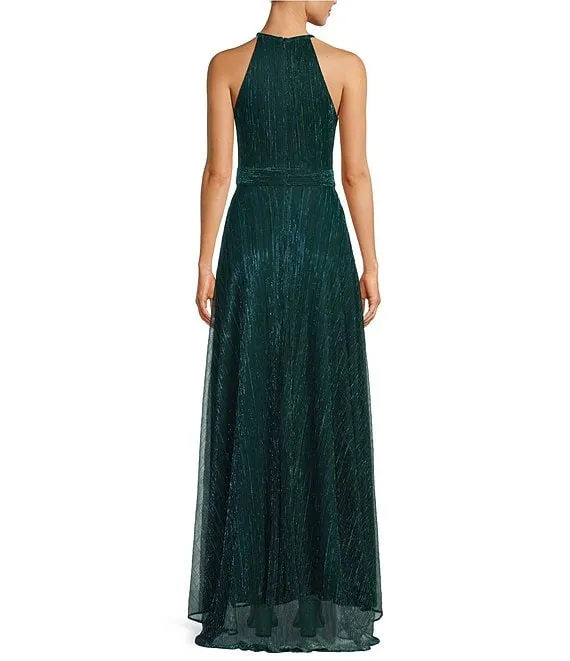 Metallic Crinkle Halter Neck Sleeveless Gown