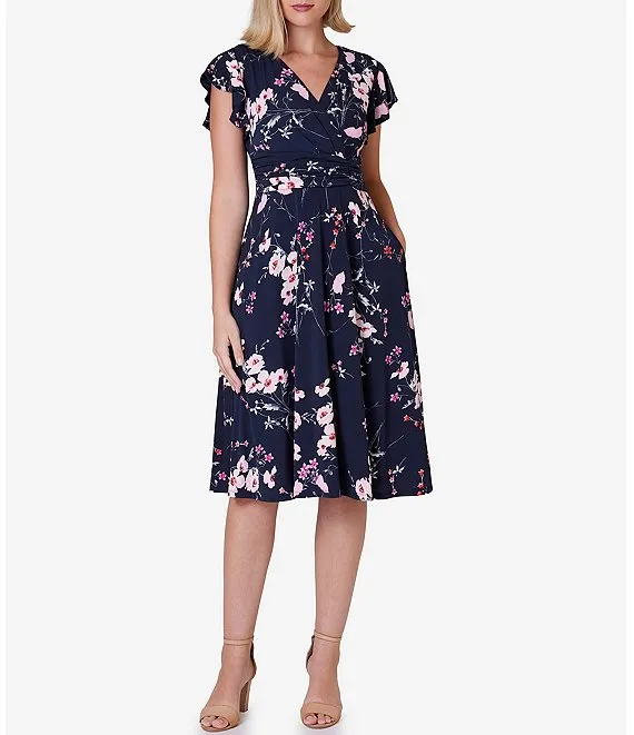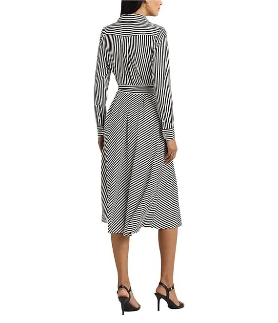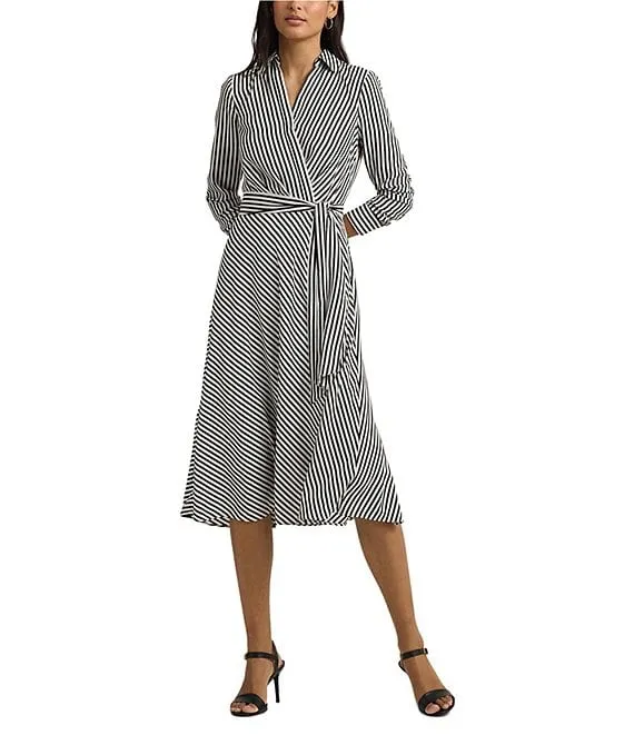 Lauren Ralph Lauren Stripe Print Surplice Collar Neck Long Sleeve Tie Front Dress