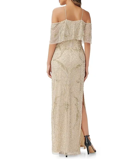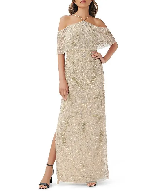 Beaded Halter Off-the-Shoulder Popover Bodice Short Sleeve Gown