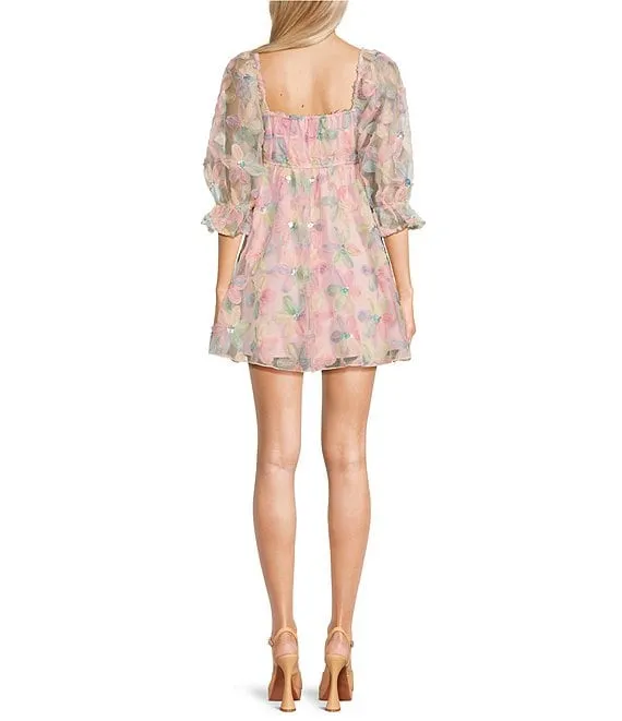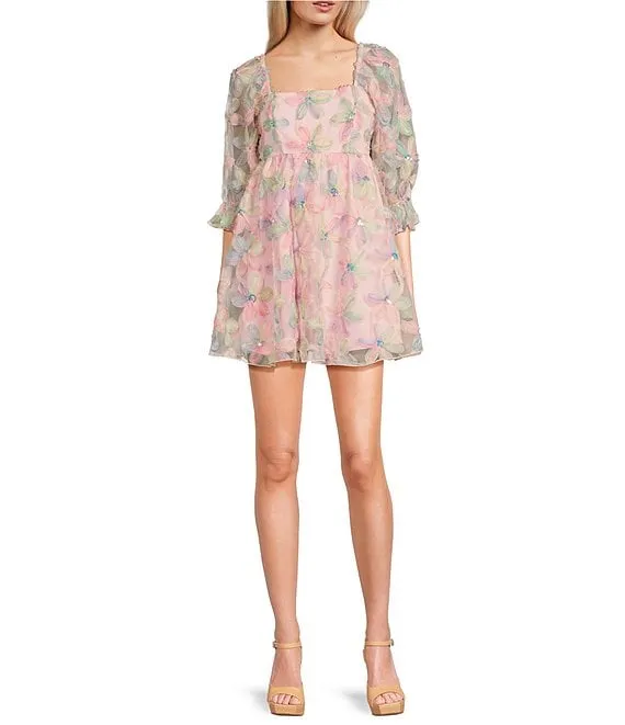 3/4" Sleeve 3D Floral Baby Doll Dress