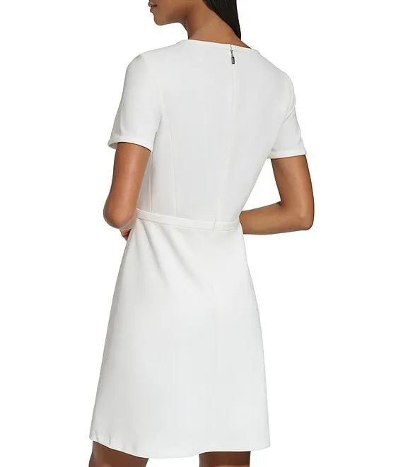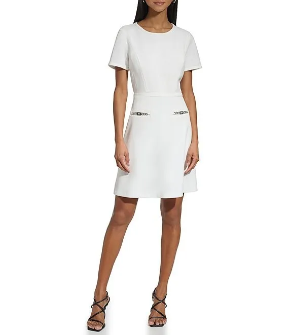 Scuba Crepe Round Neck Short Sleeve Chain Detail Dress
