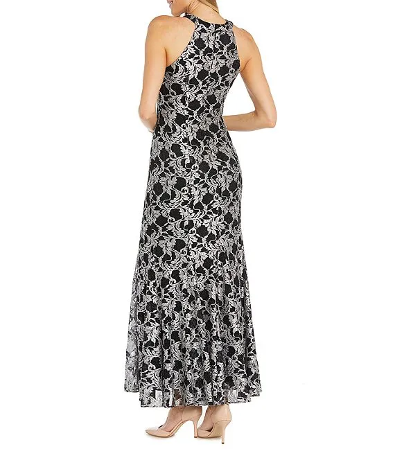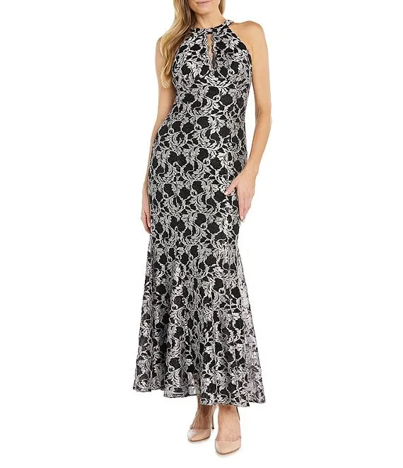 Sleeveless Keyhole Halter Neck Glitter Lace Long Dress