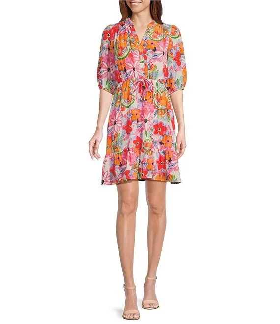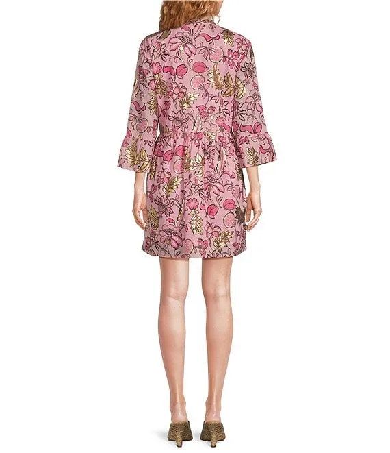 Faith Cotton Voile Fleur De Leaf Print Banded Collar 3/4 Bell Sleeve A-Line Dress