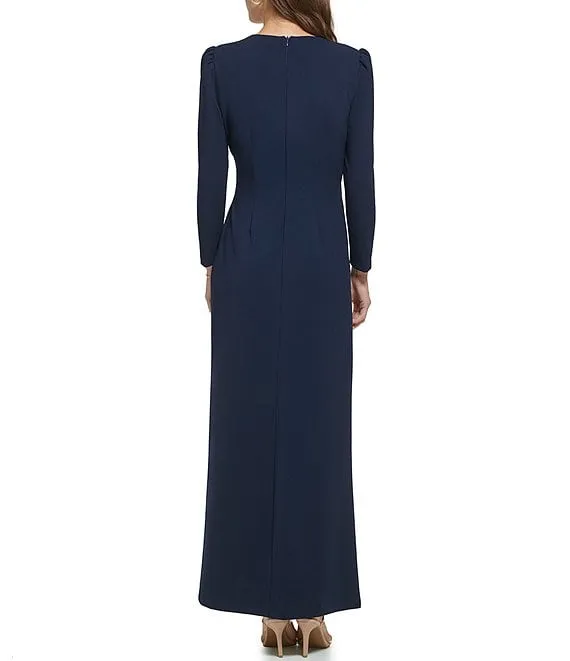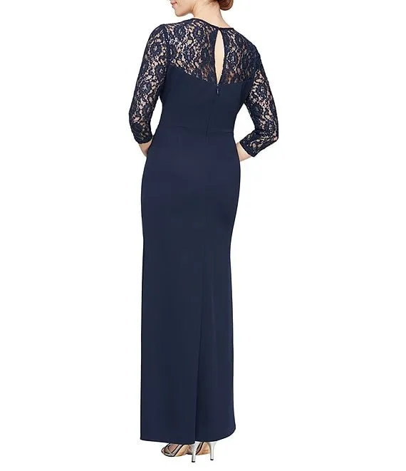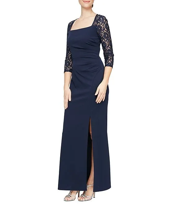 Lace 3/4 Sleeve Square Neck Illusion Keyhole Back Stretch Crepe Gown