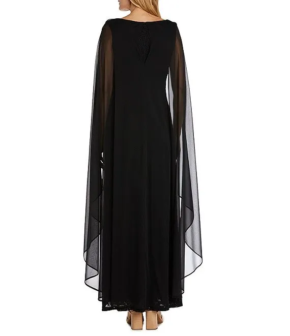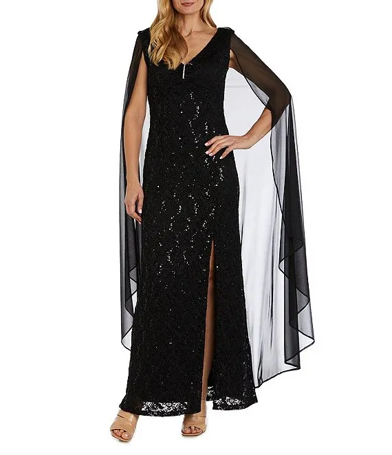 Cape Sleeve V-Neck Front Slit Glitter Lace Gown