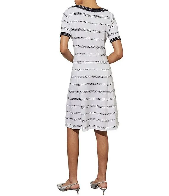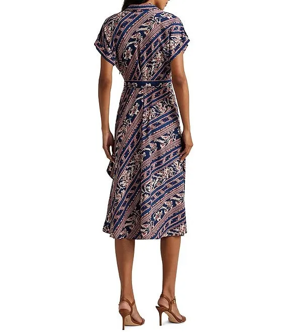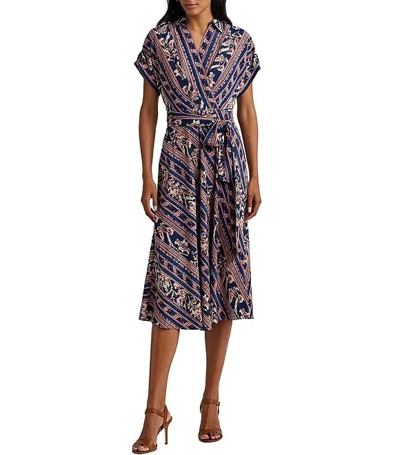 Lauren Ralph Lauren Geometric Stripe Point Collar Short Sleeve Belted A-Line Dress