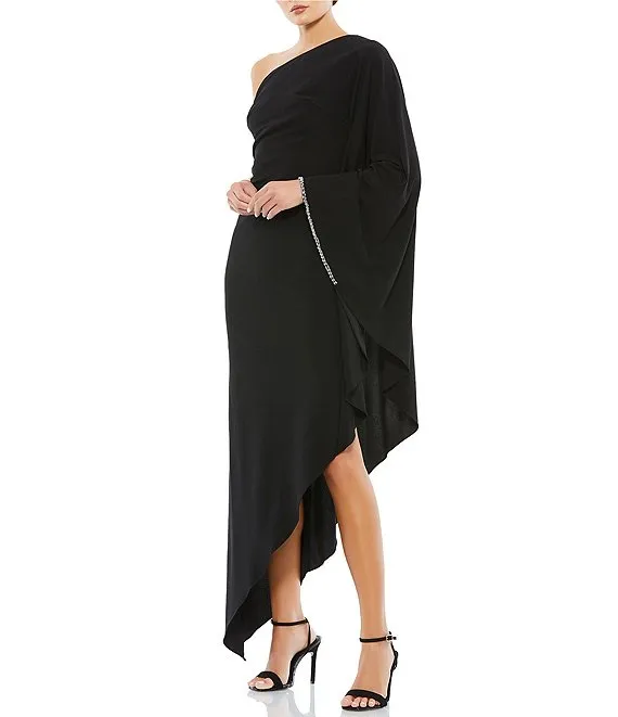 Mac Duggal Asymmetrical Hemline One Shoulder Long Cape Sheath Midi Dress